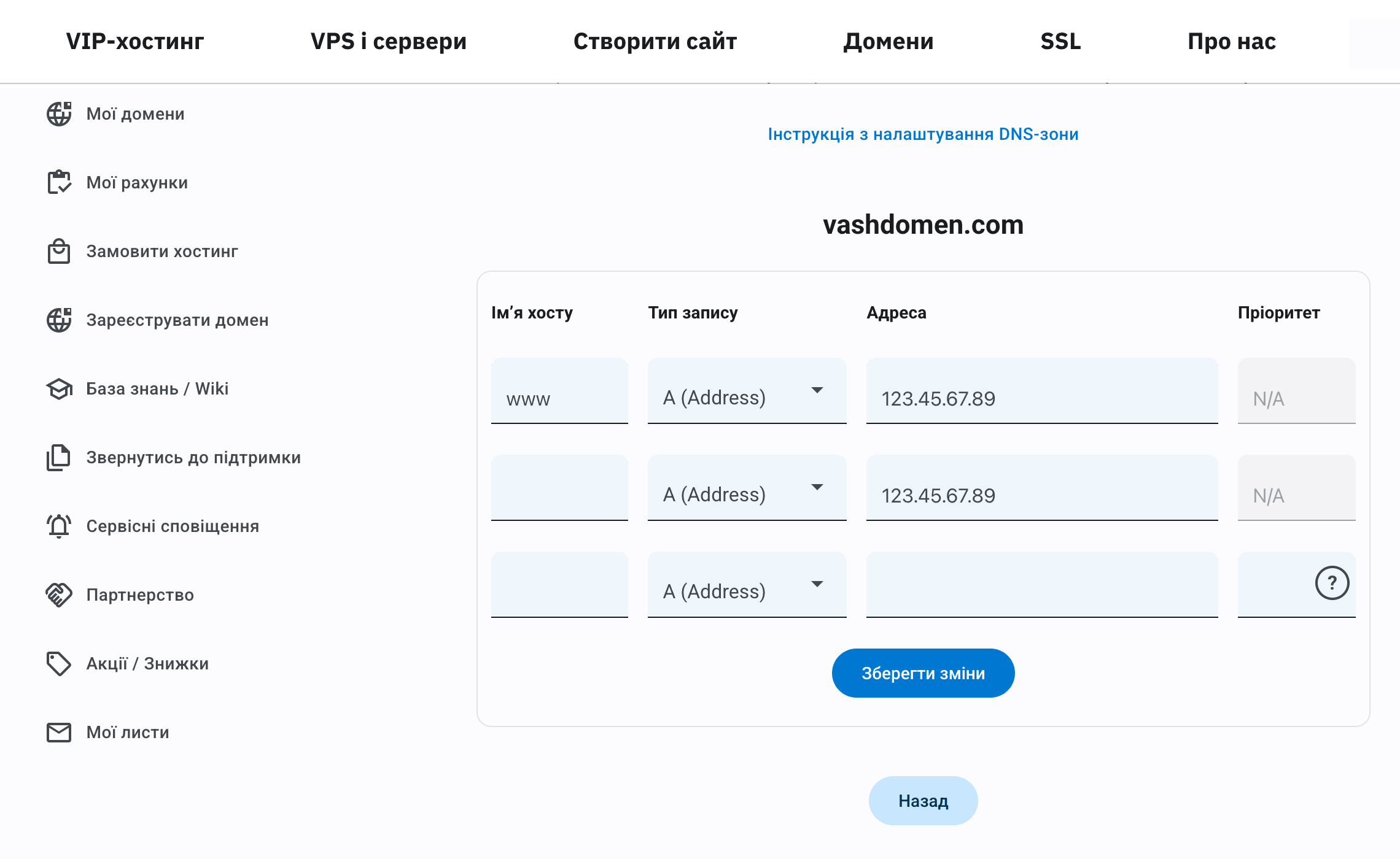• поле «Имя хоста» либо оставьте пустым, если в блоке «NS серверы» у вас стоит переключатель в пункте «Указать NS другого сервиса или VPS от HOSTiQ.ua», либо впишите сюда @, если переключатель стоит в пункте «Установить NS для управления DNS с HOSTiQ.ua без хостинга»;